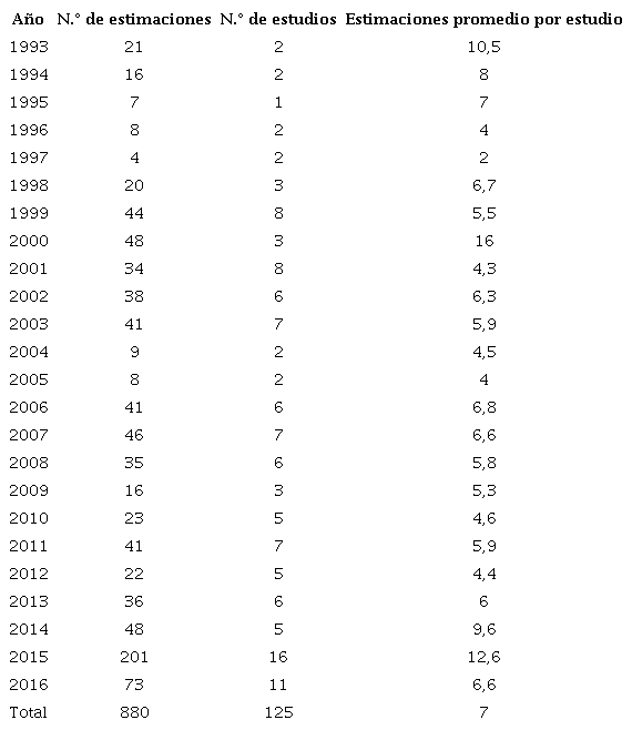 Se presenta a continuación una caracterización de los aspectos más relevantes de la muestra, en términos de estimaciones (880). En primer lugar, se observa variabilidad tanto en la cantidad de estudios como en el número de estimaciones por año (tabla 3). El rango de estimaciones va de 4 a 201, con menor evidencia empírica para artículos publicados en los periodos 1996-1997 y 2004-2005, así como un máximo en el periodo 2015-2016, explicado por una publicación del Banco Interamericano de Desarrollo (BID) para América Latina y el Caribe (Crespi et al., 2017).