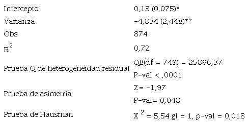 Por otro lado, hay evidencia de sesgo de publicación: no se observan efectos de tamaño negativos y no significativos, lo que hace presumir que estos resultados son descartados por los propios investigadores o rechazados para su publicación. La prueba de asimetría derivada del coeficiente estimado para la varianza indica que los efectos de tamaño no se distribuyen en forma de cono, es decir, sim étricamente.