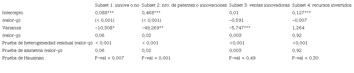 No obstante, al indagar un poco más en las distintas conceptualizaciones de la innovación, es claro que la interpretación económica de estos estimadores no es la misma. Por lo tanto, se propone segmentar la muestra en cuatro subsets más homogéneos, definidos en función de la medición de la innovación como actividades, recursos invertidos o resultado, junto con la escala de medición de las variables, tal como surge de la tabla 4. Los subsets 1, 2 y 3 corresponden a estimaciones de los resultados del proceso de innovación, distinguiendo entre las distintas escalas de medida del DI. El subset 4 incluye a las estimaciones que captan a la innovación a través de los recursos invertidos y miden al DI como una variable continua.