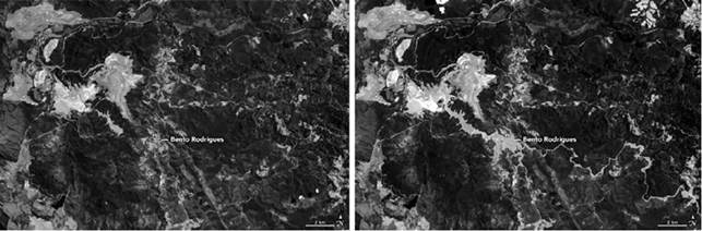 Otras ciudades se afectaron y quedaron sin agua ni energía, porque el lodo recorrió más de 665 kilómetros por el río Doce ("El desastre de Mariana", 2017; "Minera Vale causa tragedia en Brasil", 2015). Según Prensa Rural (2015), la catástrofe dejó más de 1,2 millones de personas afectadas en 39 municipios: 36 del estado de Minas Gerais y tres del estado de Espírito Santo. Por ello, ha sido catalogada como la catástrofe ambiental más grande en la historia de Brasil (figuras 1 y 2) ("Una tragedia histórica", 2015; "Minera Vale causa tragedia en Brasil", 2015).