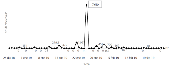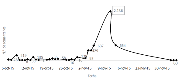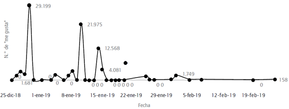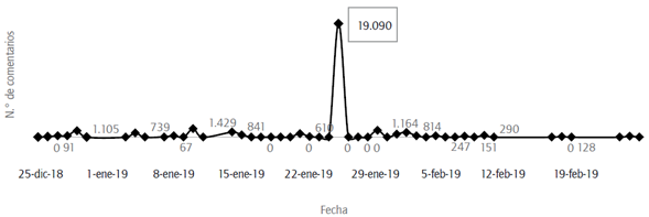 Justamente, en cuanto al nivel de participación de los grupos de interés a través de Facebook, los dos eventos tienen un comportamiento similar. Según se observa en las figuras 7 y 8, después del primer anuncio, el número de comentarios se incrementa ostensiblemente. En el caso del primer evento, el aumento porcentual fue de 235% (n = 2.136), mientras que en el segundo evento fue equivalente a 18.615% (n = 19.090) -el anuncio de la segunda catástrofe generó el mayor número de comentarios en el perfil de Vale durante el 2019-.
