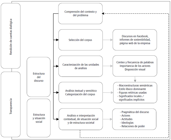 Adicionalmente, para el ACD seguimos la ruta metodológica que se muestra en la figura 5. Considerando que nuestro enfoque reclama un análisis del contexto, nuestro corpus integra los discursos en Facebook y los triangula con otros dispositivos discursivos como los informes de sostenibilidad y las páginas web de la empresa. Contrastamos esta información con redes sociales y páginas web de organizaciones sociales y grupos de interés externos a Vale. Este análisis nos permitió desvelar el sentido de los discursos de Vale a través de Facebook y poner en tensión las categorías centrales del estudio: la rendición de cuentas y la transparencia.