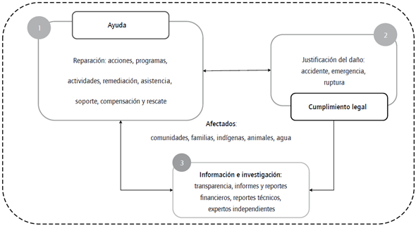 En cuanto a la transparencia, se identifica en los discursos la presencia de la macroestructura semántica 3 "información e investigación" (figura 6), y aunque Vale divulgó aspectos relacionados con las catástrofes en Facebook, su actuación está lejos de ser considerada transparente, puesto que no se evidencia qué decisiones y acciones se tomaron desde la compañía para prevenir los eventos y si existía o no conocimiento interno de los riesgos. La información dispuesta no transparenta acciones, decisiones, ni responsabilidades (Hood, 2010; Vosselman, 2016).