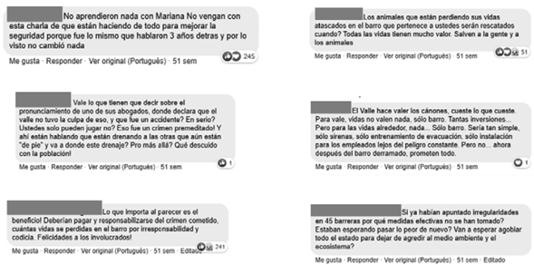El tono de los comentarios constata lo expuesto por Vignolo-Silva (2019) y por el MAB, en el sentido de que expresan disgusto, decepción y desconfianza hacia Vale. Casi la totalidad de comentarios registrados son negativos, reflejan indignación y exigen a la compañía acciones prontas para mitigar el daño. Un análisis de los hashtags más usados revela que, mientras Vale hacía uso del hashtag #ValeInforma, los usuarios viralizaron el hashtag #valeassassina, configurando una de las manifestaciones de shitstorms de los indignados de Vale (Han, 2014a). Ejemplos de los comentarios recibidos se observan en la figura 9. Omitimos la identidad de quienes comentan.