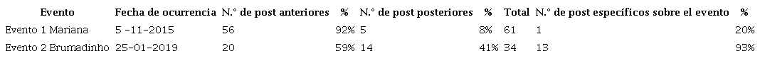 En la información dispuesta en Facebook existe un comportamiento disímil en el tratamiento de las dos catástrofes. El total de post obtenidos en cada ventana de observación se resume en la tabla 1. Mientras que en el evento del 2015 solo el 20% de los post abordaban el tema específico de la catástrofe de Mariana (n = 1), en el 2019 el 93% divulgaban información específica sobre Brumadinho (n = 13).