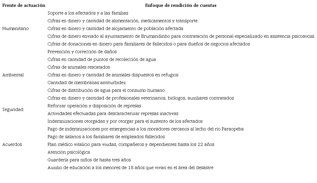 Las acciones emprendidas por Vale para "ayudar" a los afectados predominó en el discurso, con una gran cantidad de cifras posteadas de Facebook e incluidas en los informes y páginas web. Se identifica el despliegue de acciones y la destinación de recursos financieros en cuatro frentes, como se muestra en la tabla 2, que buscan plantear que el incidente se gestionó como un daño colateral, fruto de un accidente, que puede ser resarcido financieramente, sin necesidad de responder legal, moral y políticamente (Bauman, 2011). Así, se concibe la rendición de cuentas como información sobre cifras financieras vinculadas con acciones, antes que explicaciones.