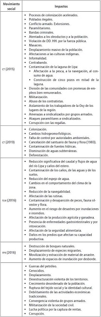 Las cuentas de CT (2015) y FPR (2016) manifiestan la dinámica económica de la explotación petrolera en Colombia, pero también la dinámica compleja sociopolítica que predomina en la región. No es solo la industria petrolera la que entrega un carácter a la región, sino también el conflicto armado y la violencia estructural. CT (2015) muestra que son varios los grupos afectados por esta dinámica compleja: los indígenas, los campesinos, los jóvenes, los sindicatos y los trabajadores, especialmente contratistas. El informe de FPR (2016) analiza las dinámicas sociales, ambientales y políticas del sector minero energético en el departamento. Para el autor, el departamento se encuentra en una situación paradójica en la que dos situaciones confluyen: el declive de la bonanza petrolera y la implementación de los acuerdos de paz entre el Gobierno y la guerrilla de las FARC. Además, según el informe, los impactos de la actividad petrolera son comunes en todo el país (tabla 2).