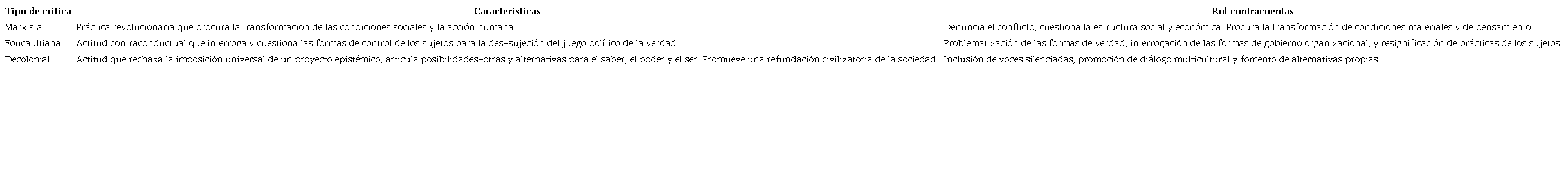 Si bien las contracuentas ejercen diversos tipos de crítica, se puede caracterizar todo este conjunto de información como una forma de ejercicio de la crítica misma (tabla 1). Primero, desde una perspectiva marxista, se considera que las contracuentas denuncian el conflicto como un elemento estructurador de las relaciones sociales y económicas; procuran la transformación de las condiciones materiales y de pensamiento del ser humano. En relación con el medio ambiente, se rechaza la dinámica extractivista y de apropiación del valor generado por el trabajo y la naturaleza, y se promueve la reestructuración de las condiciones de producción. Aquí, se hace necesario cuestionar lo presentado en la información contable oficial, ya sea buscando que esta dé cuenta de las tensiones capital/trabajo en las organizaciones (cuentas militantes) o cuestione las relaciones desiguales de poder y riqueza en la dinámica social en su totalidad (cuentas contragobierno).
