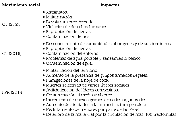 Al respecto, Ejatlas (2015) coincide con las denuncias de los movimientos sociales y agrega que, como resultado de este conflicto, se ha incrementado la corrupción; se han criminalizado activistas; se han producido muertes como la de un miembro de la comunidad indígena Nasa, identificado como Arnaldo Muñoz; se han gestado migraciones y desplazamientos, y se ha generado represión y violencia contra activistas. Estos impactos, a su vez, han fortalecido la participación de algunos movimientos sociales (Unión Sindical Obrera de la Industria del Petróleo [uso]; Asamblea Permanente de los Pueblos del Putumayo; Asociación de Comunidades del Putumayo (Acsomayo); Colectivo de Abogados José Alvear Restrepo) y la producción de contracuentas por parte de otros (CT, FPR, FLM) como estrategias para resistir el conflicto.