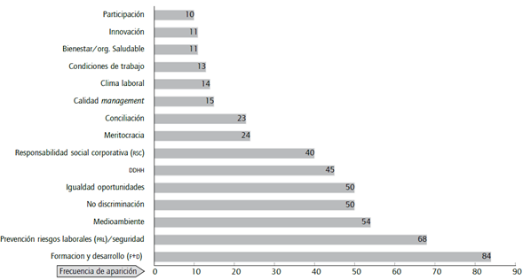 En lo referente a empleados actuales y futuros, las organizaciones, a través de sus CE, han intentado proyectar una imagen acorde a los valores centrales en la sociedad actual, como es la protección del medio ambiente, el trabajo digno, la responsabilidad social corporativa (RSC), la igualdad o la diversidad. También se han alineado con lo que instituciones de reconocido prestigio, como la Organización Internacional del Trabajo (OIT), la Organización Mundial de la Salud (OMS), la Organización para la Cooperación y el Desarrollo Económicos (OCDE) y Naciones Unidas, entre otras, promulgan en materia de trabajo, de derechos humanos y de salud laboral. Kaptein (2004) reconoce que existe suficiente evidencia como para entender que los temas con mayor prevalencia en los CE analizados en su trabajo conllevan mayor interés para las organizaciones y que más posibilidades tienen estos de ser reproducidos por otros nuevos CE de otras organizaciones.