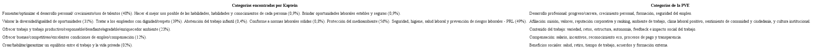 Por otro lado, si se comparan los temas de los CE referidos a empleados, seguridad, salud y medioambiente de Kaptein (2004), y se relacionan en cinco categorías que engloban tanto los aspectos que valoran los empleados del trabajo y la organización, como las empresas para atraer y fidelizar a su capital humano (desarrollo profesional, afiliación, contenido del trabajo, compensación total y beneficios sociales), se puede establecer una comparativa que se muestra en la tabla 1 y que servirá para el ulterior análisis de los CE.