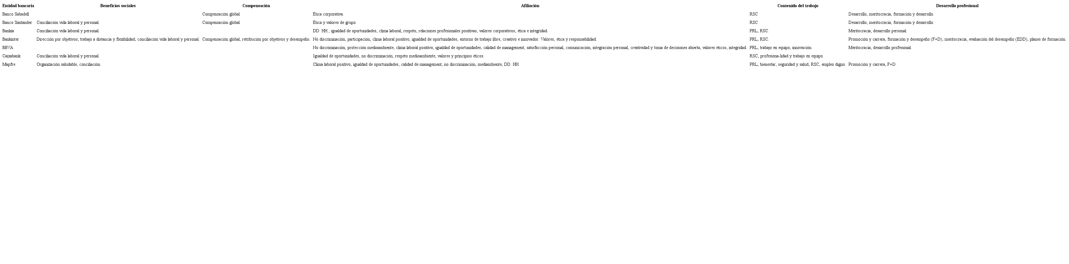 En el sector financiero, se observa cierta homogeneidad de resultados (tabla 2), con particularidades en función de la entidad analizada. En relación con la categoría beneficios, el código estrella es la conciliación de la vida personal y laboral, aunque dos bancos no reflejan medidas en esta línea. La categoría menos enraizada es compensación, suponiendo un 1°% del total de códigos. Además, cuatro entidades no reflejan códigos encuadrados en dicha categoría.