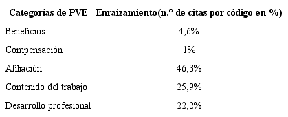 En un análisis de enraizamiento por columnas (n.° de citas por código y categoría de PVE), se observa que beneficios sociales y compensación son las categorías menos prevalentes en los CE de las empresas del Ibex 35, mientras que la categoría de afiliación casi supone la mitad del enraizamiento con un 46,3% (tabla 3).