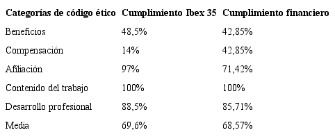 Con esta salvedad, se observa que la media de cumplimiento en las empresas del Ibex 35 es de un 69,6%, rozando el notable en términos académicos clásicos. En el sector financiero, el cumplimiento es del 68,57%, ligeramente por debajo, aunque de forma estadísticamente no significativa. En alguna de las categorías (afiliación) el seguimiento es absoluto, en otras casi (contenido del trabajo), y otras más (desarrollo profesional) presentan una cifra muy elevada. En contraste, los beneficios no alcanzan el aprobado, y la compensación es muy deficiente. Se visualiza una polarización clara por categorías: o se cumplen estrictamente y de manera destacada, o no alcanzan los mínimos, o simplemente están en una fase de implementación muy iniciática, al menos en lo que supone su comunicación mediante los CE (tabla 4).