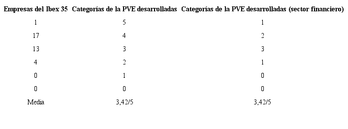En conclusión, se puede afirmar que solo dos empresas desarrollan en alguna medida las cinco categorías de la PVE (el 5,7% del total), ambas del sector bancario, mientras las que desarrollan al menos cuatro categorías son 17 (48,6%), tres categorías 13 empresas (37,1%%), dos categorías 3 (8,6%) y no hay ninguna que solo desarrolle una categoría PVE (tabla 5).