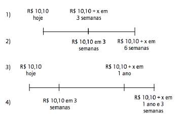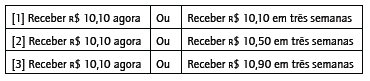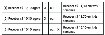 Foram apresentados aos indivíduos, segregados por grupos, quatro diferentes pares de listas de escolhas. A um dos grupos foi disponibilizada uma lista com montante baixo (valor inicial R$ 10,10), ao qual era acrescido R$ 0,40 em cada opção postergada da sequência da lista, finalizando no valor de R$ 14,10. Os pares de escolha diferiam quanto ao atraso inicial (nenhum ou três semanas) e quanto à demora para recebimento (três semanas ou um ano). Ao outro grupo, foi disponibilizada uma lista com montante alto (valor inicial R$ 404,00), ao qual eram acrescidos R$ 16,00 em cada opção postergada da sequência da lista, terminando no valor de R$ 516,00. Nesse grupo, os pares de escolha também diferiam quanto ao atraso inicial (nenhum ou três semanas) e quanto à demora para recebimento (três semanas ou um ano). Para cada tamanho de montante (baixo ou alto), foram definidas preferências para quatro combinações de momentos de pagamento, resumidas na figura 1.