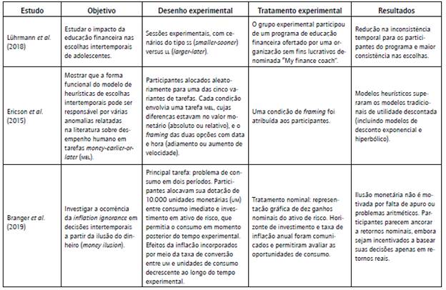 Diversos estudos têm sido desenvolvidos com o intuito de melhor compreender o comportamento em escolhas inter-temporais e a taxa de desconto usada pelos indivíduos. A tabela 1 apresenta três desses trabalhos. Os experimentos utilizam diversos tratamentos experimentais tais como participação em programa de educação financeira, diversas condições experimentais de framing e exposição a ganhos nominais do ativo de risco.