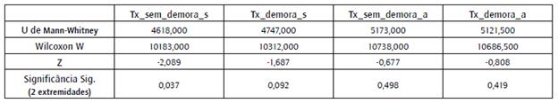 De forma similar ao comportamento observado para o tamanho do montante, verificou-se, conforme a tabela 8, que há diferença estatisticamente significativa na taxa de desconto para uma demora de três semanas, quando se comparam as escolhas intertemporais, com e sem atraso inicial. Entretanto, como observado nas estatísticas descritivas, na presença de atraso inicial, os respondentes se mostraram mais impacientes (maior taxa de desconto), algo que contraria a ideia de impaciência decrescente (Bleichrodt et al, 2016; Sutter et al, 2013).