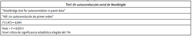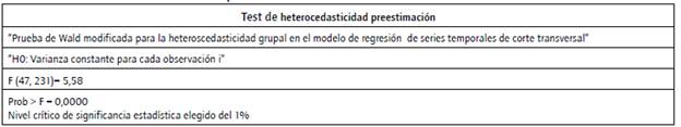 De esta manera, los estimadores son consistentes tanto si las variables explicativas están correlacionadas con la heterogeneidad permanente como si no. Cabe precisar que, a partir del análisis correlacional, se identifican algunas relaciones estadísticamente significativas, las cuales permiten la consideración de la estimación del modelo panel, y utilizar mínimos cuadrados generalizado factibles (CFLS, por sus siglas en inglés) como una opción a los modelos tradicionales de panel de efectos fijos o de efectos aleatorios, teniendo en cuenta que en las pruebas estadísticas preliminares se evidenció presencia de heterocedasticidad (identificada por medio de la prueba de Wald ajustado por grupos). Así, la estimación del modelo por medio de CFLS constituye una mejor alternativa cuando la varianza de las estimaciones pueda resultar desigual, la prueba F para heterocedasticidad arroja como resultado que la varianza no es constante para las observaciones transversarles, (anexos 2 y 3). Dado lo anterior, se ha condicionado la estimación para un panel heterocedástico corregido sin presencia de autocorrelación; la prueba, considerada para autocorrelación, fue la prueba de Wooldridge, que dio como resultado la no presencia de autocorrelación serial.