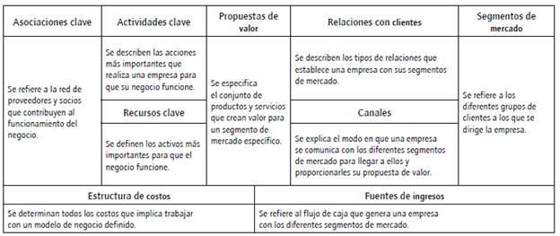 Para la operacionalización del modelo de negocio, se han propuesto diferentes estructuras para representarlo. Osterwalder y Pigneur (2016) proponen el esquema del lienzo de nueve módulos: i) propuesta de valor, ii) segmentos de mercado, iii) canales de comercialización, iv) relaciones con clientes, v) fuentes de ingresos, vi) recursos clave, vii) actividades clave, viii) asociaciones clave y ix) estructura de costos. Otra representación es propuesta por Demil y Le-cocq (2010) y se basa en tres componentes: i) recursos y capacidades, ii) organización interna y externa, y iii) propuesta de valor. Zott et al. (2011) destacan que los modelos de negocio desempeñan un papel central en la explicación de los resultados empresariales y, para validar esta idea, el surgimiento de herramientas para la representación y análisis de modelos de negocio ha sido fundamental. Asimismo, en un sentido práctico, Osterwalder et al. (2005) mencionan que el desarrollo de representaciones esquemáticas del modelo de negocio ha servido para estimular la creatividad de los empresarios y ayudarlos a dar seguimiento a sus empresas, y evolucionarlas a estados deseables.