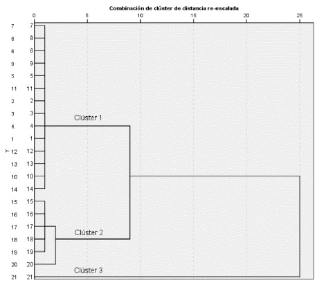 El análisis de clústeres generó el dendrograma que se ilustra en la figura 2. En él se muestra, mediante una estructura ramificada, las empresas productoras de leche que tienen similitudes con respecto a su escala. Al realizar un corte en cinco en la distancia de aglomeraciones reescalada, se distinguen tres grupos: el clúster 1 se compone de 14 empresas; el clúster 2, de seis, y el clúster 3 se conforma solamente por una empresa.