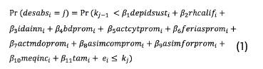 En cuanto a las técnicas econométricas, debido a que la variable dependiente (DA) es discreta y toma valores ordenados (1, 2, 3 o 4), se especificó el siguiente modelo logit ordenado (ecuación 1; Cameron & Trivedi, 2005)8: