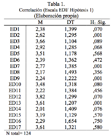 A la vista de los resultados de la tabla 1, se puede observar que las medias son distintas y que no en todas la variables de la escala EDI las desviaciones típicas son similares.