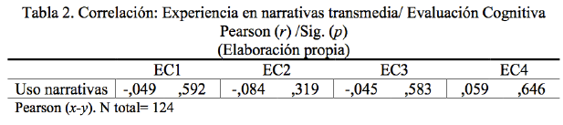 En contestación a la segunda hipótesis H2 sobre si la evaluación cognitiva es mayor para aquellos observadores que han disfrutado de la ficción a través de propuestas multiplataforma o narraciones transmedia, según los datos obtenidos en la tabla 2, no existe ninguna correlación entre ambas variables. Aunque no es posible advertir una dependencia significativa entre el mayor uso de las propuestas transmedia y su evaluación cognitiva, la correlación Pearson (-1,+1) ha resultado negativa en EC1, EC2 y EC3, es decir que existe una relación inversa entre el uso de estas narrativas y la evaluación cognitiva. En este caso se demuestra que un mayor uso de los productos multiplataforma produce una menor reflexión general sobre la serie y una disminución de la empatía sobre la formación y desarrollo de los personajes, así como también una menor intensidad del argumento de ficción como experiencia vital.