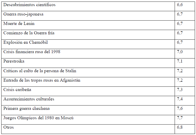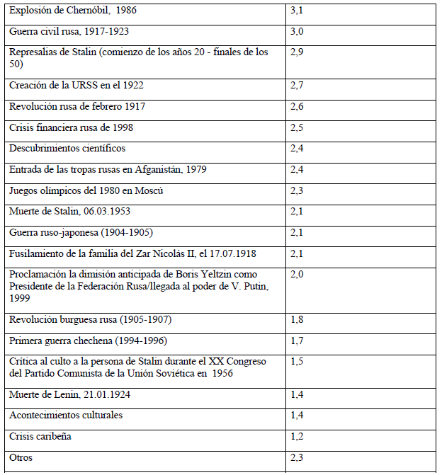 Si queremos destacar los acontecimientos históricos mencionados por la mayoría de los encuestados, en la primera decena aparecen: la gran guerra patriótica rusa (9,1 % de la suma de todos); la Revolución rusa de octubre (8,8 %); la disolución de la URSS (8,7 %); el vuelo al espacio de Y. Gagarin (8,1 %); la Primera Guerra Mundial (7,0 %); la Segunda Guerra Mundial (4,1 %); la guerra fría (4,0 %); la Perestroika (3,7 %); la creación de la bomba nuclear (3,2 %) y la explosión en Chernóbil (3,1 %).