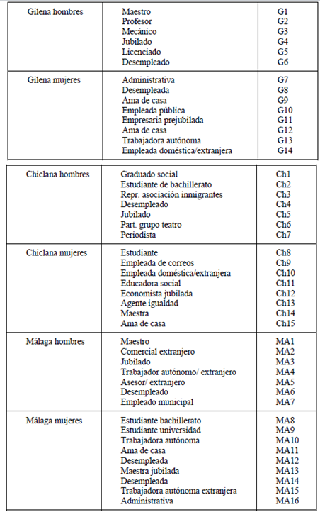 Sus intervenciones han quedado codificadas en el texto, e identificadas conforme a esta tabla: