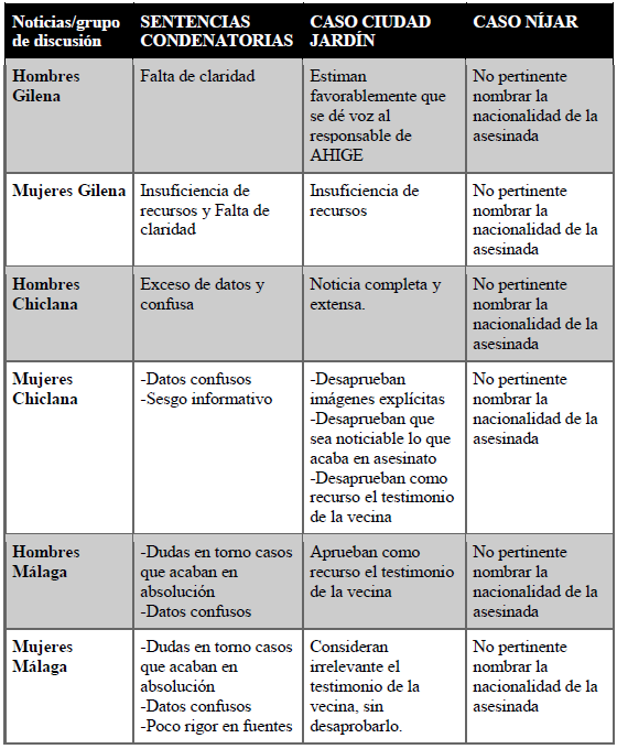 Otro de los aspectos más cuestionados acerca de las informaciones resultó de la identificación de las personas representadas, y lo saca a la luz la mención de la nacionalidad de la mujer asesinada y el asesino de “Caso Níjar”, ambos marroquíes, dato en el que la noticia insiste en repetidas ocasiones. Este hecho provoca el rechazo general del grupo, cuyos miembros no reconocen aportación alguna del dato de la nacionalidad, consideran que se produce una discriminación que contradice lo que ellos perciben como un hecho objetivo, esto es, que se trata de una excepción y les preocupa que la mención a la nacionalidad contribuye, consciente o inconscientemente, a asentar la idea de una mayor incidencia de la violencia machista entre minorías étnico-culturales, y que esta diferenciación afecte a la empatía de los espectadores hacia la víctima del crimen machista, por tratarse de algo ajeno.