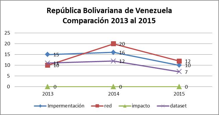 Se observa que México, se encuentra en el puesto 16 del Open Data Barometer de 2015, ascendido 12 puestos con respecto al año 2014, y Venezuela, se encuentra en el puesto 78 del ranking que comparte con países como Bangladesh, Malawi, Namibia, Ethiopia Cameroon y Botswana, descendio 10 puestos del ranking del año 2014. Al revisar los datos de la República Bolivariana de Venezuela del barómetro de los años 2013 al 2016 que se muestran en el gráfico 1, se encuentra que va en descenso