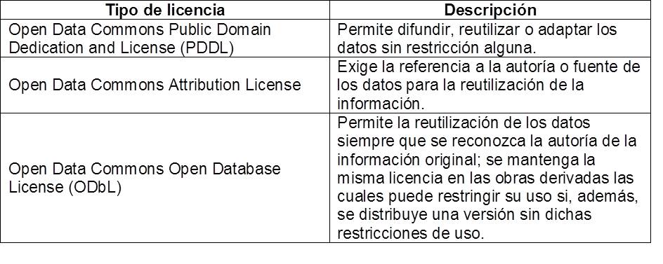 Asimismo, la organización OKFN (Open Knowledge Foundation Network) desarrolló las primeras licencias específicas para datos abiertos (véase cuadro 1), Open Data Commons, permite la reutilización de los datos siempre que se reconozca la autoría de la información original; se mantenga la misma licencia en las obras derivadas, las cuales pueden restringir su uso si, además, se distribuye una versión sin dichas restricciones de uso.