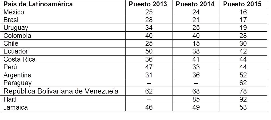 Iniciativas importantes de países como México, Chile, Colombia, Brasil, Educador, entre otros, han logrado trascender ante el solo hecho de tener accesibilidad a los datos, implementado modelos y estándares para los datos públicos que han demostrado producir cambios importantes no sólo en el sector público, sino que además generan sinergias en la innovación y el emprendimiento. En el cuadro 2, se muestra la ubicación de los países latinoamericanos en el barómetro de la World Wide Web Foundation (2016). Este barómetro es un indicador mundial que clasifica a 92 países con base a los estándares de publicación de datos gubernamentales claves, beneficios y pruebas de su impacto (www.opendatabarometer.org).