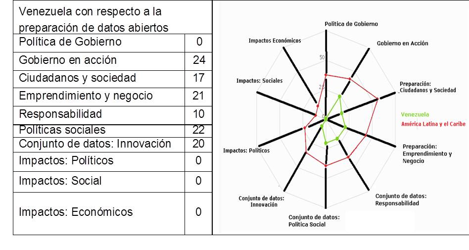 El cuadro 3 se presentan las secciones donde se evalúa el impacto de Open Data del barómetro del año 2016, y en el caso de Venezuela, se encuentra con secciones sin data estadística que respalde las políticas del gobierno, y el impacto político, social y económico.