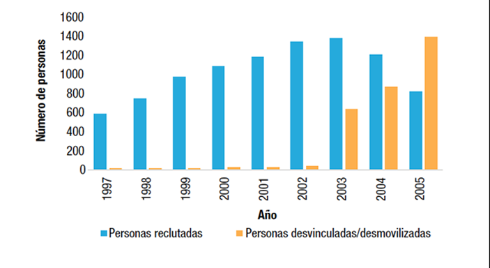 En el caso de las AUC [Autodefensas Unidas de Colombia]: Los niños, niñas y adolescentes desvinculados de las AUC reciben con menor frecuencia atención familiar, se desvincularon con mayor frecuencia ante el gobierno central, son atendidos por servicios en hogar gestor y hogar tutor con mayor frecuencia, su tiempo de desvinculación es mayor comparado con otros grupos y su desvinculación es menos voluntaria y más por entrega. Igualmente, la tendencia es que muestran una escolaridad más alta al compararlos con los niños, niñas y adolescentes desvinculados de otros grupos.