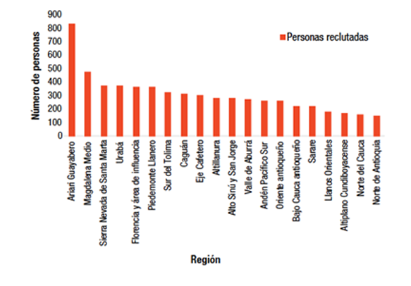 En el informe se sostiene que los datos obtenidos de la base del Observatorio de Memoria y Conflicto, OMC, refrendan que en el proceso de reclutamiento las variaciones regionales son inocultables y tienen estrecha relación con las bases consolidadas por los actores armados en los territorios en donde lograron una fuerte regulación de la vida cotidiana y social. Los picos desagregados por actor muestran que tanto guerrillas como paramilitares apelaron a sus bases sociales a la hora de reclutar para llevar a cabo sus procesos expansivos o las disputas territoriales61. Además, se demuestra con cifras que no fue un tema rural sino también urbano. La figura 2 muestra las personas reclutadas por regiones.