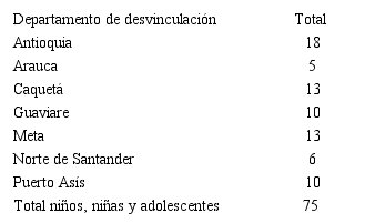 Por las Farc: Frente 21, 104; Frente 48, 129; Frente 6, 86, Frente 49, 74; Frente 47, 69; Frente 40, 66; Frente 34, 59; Frente 32, 100; Frente 29, 79; Frente 27, 53; Frente 18, 61; Frente 16, 60; Frente 14, 65; Frente 15, 70; Frente 10, 52, y Frente 1, 66. Los departamentos con tasas superiores a 100 niños, niñas y adolescentes reclutados por 100.000 habitantes menores de edad son Caquetá (225 por 100.000), Vaupés (184 por 100.000), Guaviare (174 por 100.000), Putumayo (146 por 100.000), Arauca (144 por 100.000), Meta (124 por 100.000), Casanare (115 por 100.000) y Guainía (100 por 100.000). En cuanto a la edad de reclutamiento de niños, niñas y adolescentes, el promedio fue de 13,5 años y la misma estuvo entre los 0 y los 17 años. El grupo de edad de niños, niñas y adolescentes muy pequeños. Esto se debe a que nacieron dentro de los grupos armados. En cuanto a las características de estos niños, niñas y adolescentes se encontró que en la actualidad los niños, niñas y jóvenes tienen entre 11 y 32 años de edad. La edad promedio de desvinculación de los niños, niñas y adolescentes es de 17 años. El rango oscila entre los 9 y los 18 años. El 28% de los desvinculados fueron niñas y el 72%, niños. El departamento en el cual nacieron más niños, niñas y adolescentes de los grupos armados al margen de la ley fueron Antioquia, seguido por Caquetá, Meta y Tolima8.