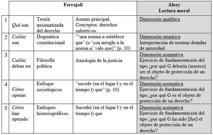 Los objetivos de esta tabla son, entonces, los siguientes: limitar tal tipo inicial de constitucionalismo al trabajo de Alexy; enfocar esta limitación a un elemento específico de su teoría dogmática, a saber, el de los derechos subjetivos y en tanto que “juego de lenguaje mediante el cual creamos realidad social”17. Finalmente, presentar mediante una contraposición con Ferrajoli la manera en que este juego de lenguaje configura los diferentes ámbitos de nuestro conocimiento.