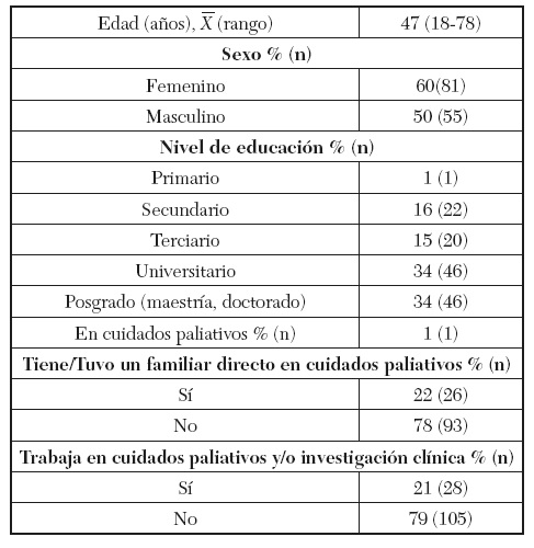 La edad media de los participantes fue de 47 años, el 60% fueron mujeres, y el 68% tenía un título universitario o de posgrado (maestría o doctorado). Un participante se encontraba en cuidados paliativos y el 22% tenía o había tenido un familiar directo en esa instancia. El 21% trabajaba en cuidados paliativos o en investigación clínica (tabla 1).