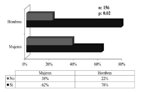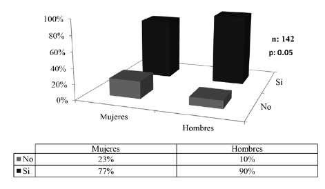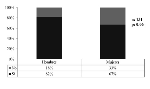 En el análisis bivariado, el sexo mostró diferencias en cuanto a si es ética la investigación en estos pacientes. Mientras los hombres contestaron que sí en un 90 % de los casos, las mujeres lo hicieron en un 77%, esta diferencia fue marginalmente significativa (p = 0,05) (figura 1). También se encontraron diferencias en cuanto a la participación en estudios con una rama placebo: el 82% de hombres y el 67% de las mujeres estaría de acuerdo (p = 0,06) (figura 2). El 78% de los hombres y el 62% de las mujeres decidiría incluir a su familiar en un estudio, aun si su capacidad de decisión estuviera alterada (p = 0,02) (figura 3).
