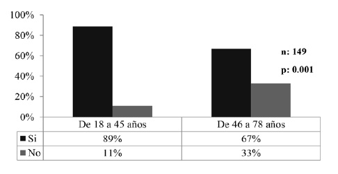 Con respecto a la edad, el 89% de los participantes más jóvenes (18 a 45 años) consideraron ético este tipo de estudios, mientras que de los mayores (46 a 78 años) solo el 67% estuvo de acuerdo, esta diferencia fue altamente significativa (p = 0,001) (figura 4).