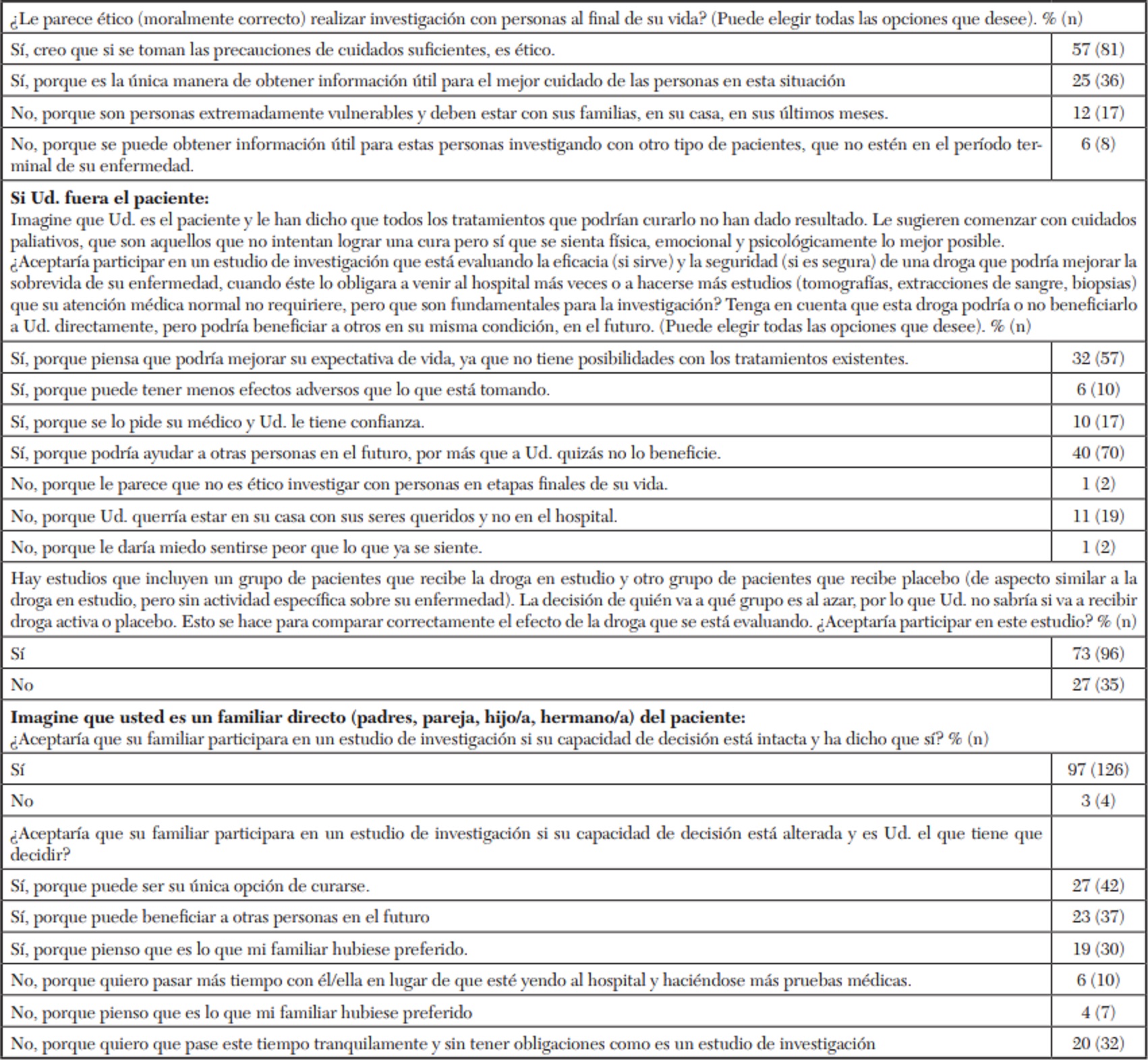 Con respecto a qué ocurriría si quien está en cuidados paliativos es un familiar directo, el 97% estaría de acuerdo en que este participara en un estudio de investigación si su capacidad de decisión está intacta y está de acuerdo en participar, mientras que el 69% dijo que aceptaría que su familiar ingrese al estudio, aun si su capacidad de decisión está alterada y es el participante quien tiene que decidir, sobre todo porque consideraron que podría ser la única opción de curarse (27%) o porque podría ayudar a otros en el futuro (23%). Del 31% que no daría su consentimiento, el 20% consideró que su familiar debería pasar ese tiempo tranquilamente y sin obligaciones (tabla 2).