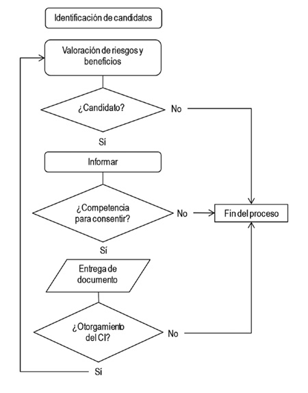 Como se ilustra en la figura 1, el proceso del consentimiento informado empieza cuando un investigador, tras haber identificado un posible participante, le realiza una evaluación de los riesgos y beneficios que represente para su estado salud el participar en un estudio de investigación, para que de esta manera pueda determinar si es viable o no. Si el sujeto es candidato, el investigador deberá informarle sobre los aspectos generales y específicos del estudio; posteriormente, el investigador deberá evaluar la competencia que tiene para consentir y de esta manera hacer entrega del documento y, en caso de que el candidato decida otorgar voluntariamente su consentimiento, proseguir con las respectivas firmas.