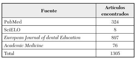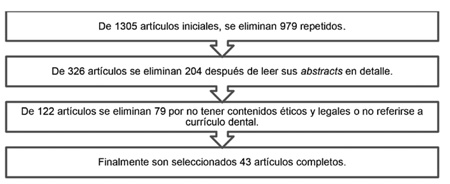 Se revisa manualmente la literatura publicada en bases de datos indexadas en SciELO entre los años 1999-2014, que se encuentran bajo los títulos: ciencias de la salud, humanidades, ciencias sociales aplicadas, a las que se puede acceder on-line, a texto completo, gratuito, en forma anónima y también en las siguientes revistas especializadas de educación en salud: Journal of Dental Education (ADEA), Journal of Medical Education (AMM), con los mismos títulos, durante el mismo periodo y a través del motor de búsqueda PubMed vía Medline. Para esto se utilizó el tesauro MeSH con la siguiente estrategia de búsqueda: “Problem-Based Learning”[Mesh], “Education,Dental,Graduate”[Mesh], “Teaching”[Mesh], “Education,Dental”[Mesh], “Students,Dental”[Mesh], “Forensic Dentistry”[Mesh], “Legislation, Dental”[Mesh], “Ethics, Professional”[Mesh], “Ethics, Dental”[Mesh], “Ethics, Clinical”[Mesh], “Case Reports”[Mesh], legislation and jurisprudence [Subheading].