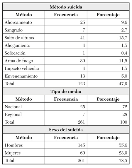 La variable cruzada sobre el método suicida usado con la muestra tomada mostró que en los medios nacionales el mayor porcentaje está en lanzamiento al vacío, con un 73,3 % (33 casos); mientras que en la región era del 19,5 % (8 casos). El segundo grupo, que reunió las muertes por sangrado, ahogamiento, electrocución y sofocación, mostró una relación del 66,7 % para el ámbito nacional y del 33,3 % para el ámbito regional. Por último, se encontró que las muertes por ahorcamiento fueron más comunes en medios regionales, con un 68 %, contra un 32 % en medios nacionales. En esta asociación se encontró una relación significativa, que mostró validez en los datos.