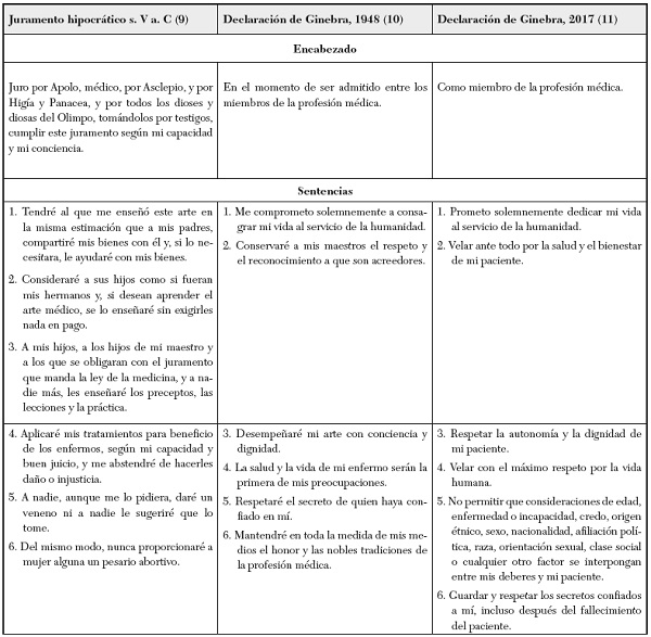 Observar los componentes del Juramento hipocrático y de las dos últimas versiones de la Declaración de Ginebra permite apreciar sus diferencias y constatar el alcance de los cambios que se han venido produciendo. Para realizar esta comparación se examinan siete componentes de los textos citados: carácter de la declaración, tiempo verbal, extensión en apotegmas, núcleo epistémico, omisiones, innovaciones y tipo deethos.