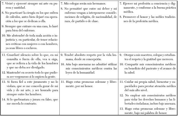 1948. El Juramento hipocrático expresa una gran estimación por quienes enseñaron el oficio, que se expresaba incluso en el compartir los bienes propios; las posteriores versiones se quedan solo en el respeto, el reconocimiento y la gratitud, pero el afecto y el aprecio no son mencionados. No se alude al beneficio a los enfermos. La consagración de la vida al servicio de la humanidad resulta impersonal.