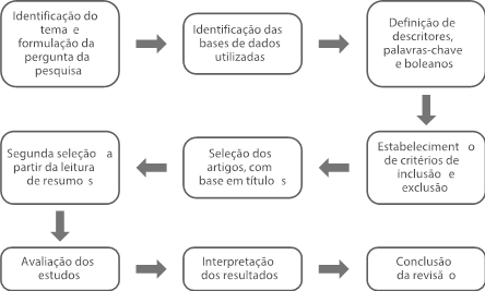 A pesquisa foi realizada em seis fases: 1) identificação da hipótese, elaboração da pergunta norteadora, que determina quais os estudos que serão incluídos; 2) seleção de critérios para inclusão ou exclusão de estudos, amostragem ou busca na literatura; 3) definição das informações a serem extraídas dos estudos selecionados e categorização dos estudos; 4) avaliação dos estudos incluídos na revisão integrativa por meio da análise temática por aproximação; 5) interpretação dos resultados; 6) apresentação e conclusão da revisão integrativa 11.