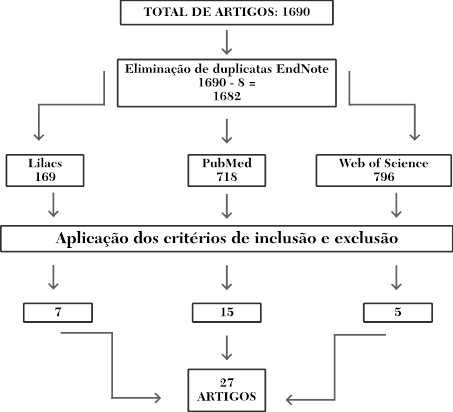 Ao realizar o cruzamento com os descritores mencionados, foi encontrado o total de 1690 artigos. Após a busca, os artigos foram armazenados no programa Endnote, que permitiu a eliminação de duplicatas, que diminuíram 8 artigos, totalizando 1682. Após a seleção dos artigos com base nos critérios de inclusão para que fosse permitida a formação de categorias por aproximação temática 12, foi realizada a leitura na íntegra de 27 artigos (13-39.